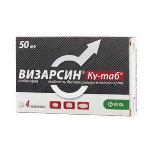 Показания к применениюЛечение эректильной дисфункции, характеризующейся неспособностью к достижению или сохранению эрекции полового члена, достаточной для удовлетворительного полового акта. Эффективен только при сексуальной стимуляцииПрименение при беременности и кормлении грудьюПо зарегистрированному показанию препарат Визарсин Ку-таб не предназначен для применения у женщинПротивопоказанияПовышенная чувствительность к силденафилу или любому другому компоненту препарата; одновременное применение с донаторами оксида азота (NO) (например амилнитрит) или нитратами в любой форме, т.к. силденафил может усилить антигипертензивное действие нитратов (опосредовано через NO/цГМФ); мужчины, которым не рекомендуется сексуальная активность (например пациенты с тяжелыми сердечно-сосудистыми заболеваниями, такими как нестабильная стенокардия или тяжелая сердечная недостаточность); одновременное применение с другими ЛС для лечения эректильной дисфункции (безопасность и эффективность не изучалась, см. «Особые указания»); одновременное применение с ритонавиром; потеря зрения на один глаз вследствие передней ишемической оптической нейропатии неартериального генеза, независимо от того, связана она или нет с применением ингибиторов ФДЭ-5 (см. «Особые указания»; тяжелые нарушения функции печени; артериальная гипотензия (АД менее 90/50 мм рт. ст.); недавно перенесенное нарушение мозгового кровообращения или инфаркт миокарда; фенилкетонурия; наследственные ретинальные дистрофии (наследственные дегенеративные заболевания сетчатки), такие как пигментный ретинит (у некоторых пациентов имеются генетические дефекты ФДЭ сетчатки), т.к. безопасность применения препарата Визарсин Ку-таб у таких пациентов не изучалась; пациенты с врожденной непереносимостью фруктозы (т.к. в состав входит сорбитол); дети до 18 лет и женщины. С осторожностью: артериальная гипертензия (АД выше 170/100 мм рт. ст.); жизнеугрожающие аритмии; обструкция выносящего тракта левого желудочка сердца (стеноз аорты, гипертрофическая обструктивная кардиомиопатия (ГОКМП) или синдром множественной системной атрофии; анатомическая деформация полового члена (ангуляция, кавернозный фиброз или болезнь Пейрони); состояния, предрасполагающие к приапизму (серповидно-клеточная анемия, множественная миелома или лейкемия); одновременный прием альфа-адреноблокаторов; заболевания, сопровождающиеся кровотечением, или обострение язвенной болезни желудка или двенадцатиперстной кишки; эпизоды развития передней неартериитной ишемической нейропатии зрительного нерва в анамнезе.СоставАктивное вещество: силденафил 50 мг. Вспомогательные вещества: гипролоза — 3 мг, маннитол — 81 мг, аспартам — 0.75 мг, неогесперидиндигидрохалкон — 0.25 мг, ароматизатор мятный — 0.5 мг, ароматизатор мяты перечной — 0.5 мг, кросповидон типа А — 20 мг, кальция силикат FM1000 — 40 мг, магния стеарат — 4 мг.