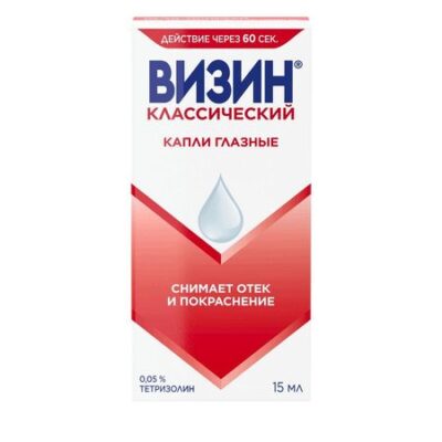 Показания взрослым и детям старше 2 лет для снятия отека и гиперемии конъюнктивы (покраснения глаз), обусловленных воздействием химических и физических факторов (дым, ветер, пыль, хлорированная вода, свет, косметические средства, контактные линзы), а также возникающих при аллергических реакциях, таких как поллиноз. Фармакологическое действие Тетризолин — симпатомиметический препарат, который стимулирует α-адренорецепторы симпатической нервной системы, но не оказывает или оказывает слабое действие на β-адренорецепторы. Являясь симпатомиметическим амином, тетризолин обладает сосудосуживающим действием и уменьшает отек тканей. Эффект начинается через 60 секунд после закапывания и продолжается 4–8 ч. Лекарственное взаимодействие Препарат Визин® Классический не следует применять одновременно с ингибиторами МАО типа транилципромина, трициклическими антидепрессантами, а также препаратами, повышающими АД. Комбинированная терапия с данными группами лекарственных препаратов может привести к усилению сосудосуживающего действия и повышению АД.