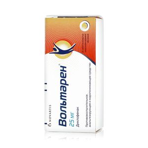 Показания к применению— воспалительные и дегенеративные заболевания опорно-двигательного аппарата, в т.ч. ревматоидный, ювенильный, хронический артрит анкилозирующий спондилит и другие спондилоартропатии остеоартроз подагрический артрит бурсит, тендовагинит — болевые синдромы со стороны позвоночника (люмбаго, ишиалгия, оссалгия, невралгия, миалгия, артралгия, радикулит) — посттравматический послеоперационный болевой синдром, сопровождающийся воспалением (например, в стоматологии и ортопедии) — альгодисменорея — воспалительные процессы в малом тазу (в т.ч. аднексит) — инфекционно-воспалительные заболевания ЛОР-органов с выраженным болевым синдромом (в составе комплексной терапии): фарингит, тонзиллит, отит. Изолированная лихорадка не является показанием к применению препарата. Препарат предназначен для симптоматической терапии, уменьшения боли и воспаления на момент использования, на прогрессирование заболевания не влияет.Применение при беременности и кормлении грудьюБезопасность применения диклофенака у беременных женщин не изучена. Поэтому Вольтарен . следует назначать в I и II триместрах беременности только в тех случаях, когда ожидаемая польза для матери превышает потенциальный риск для плода. Вольтарен ., как другие НПВС ингибиторы синтеза простагландинов, противопоказан в III триместре беременности (возможно подавление сократительной способности матки и преждевременное закрытие артериального протока у плода). Поскольку Вольтарен ., как и другие НПВС, может оказывать отрицательное действие на фертильность, женщинам, планирующим беременность, не рекомендуется принимать препарат. У пациенток, проходящих обследование и лечение по поводу бесплодия, препарат следует отменить. Несмотря на то, что диклофенак, как и другие НПВС, выделяется с грудным молоком в малом количестве, Вольтарен . не следует назначать кормящим женщинам во избежание нежелательного влияния на ребенка. При необходимости назначения препарата в период лактации грудное вскармливание следует прекратить.Состав1 таб. диклофенак натрия 25 мг. Вспомогательные вещества: кремния диоксид коллоидный безводный — 6 мг, целлюлоза микрокристаллическая — 10 мг, лактозы моногидрат — 16 мг, магния стеарат — 1 мг, крахмал кукурузный — 50 мг, повидон К30 — 2 мг, карбоксиметилкрахмал натрия — 20 мг.