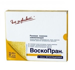 Воскопран с мазью метилурациловой 10% повязка на рану — это повязка мазевая атравматическая с восковым покрытием, стерильная.Повязка предназначенный для ускорения заживления гранулирующих и вялозаживающих ран во второй фазе раневого процесса: дерматитов, ожогов, пролежней, фурункулов, трофических язв, послеоперационных швов, фотодерматозов, лучевых поражений.В комплект входит 30 листов размером 10х10 см, покрытых тонким слоем мази метилурацила. Воск оказывает стимулирующее действие на репаративные процессы в ране, благодаря чему процессы заживления протекают более интенсивно. Фармакологические свойства определяются видом нанесенного на повязку лекарственного средства.ВоскоПран с мазью метилурацил обладает заживляющим действием.Воскопран — мазевая повязка с уникальными «живыми» свойствами. В основе ее разработки лежит открытие российских ученых, которыми было установлено, что рана воспринимает органику воска как активную ранозаживляющую среду. Пчелиный воск — это гемолимфа насекомого, которая содержит большое количество аминокислот, минеральных веществ и витаминов. Воск оказывает стимулирующее действие на репаративные процессы в ране, благодаря чему процессы заживления протекают более интенсивно.1. Сетчатая основа со специальным плетением ячеек дренирует экссудат (раневое отделяемое) и пропускает его во вторичную повязку.2. Благодаря уникальным свойствам воска повязка Воскопран на начальной, воспалительной, стадии раневого процесса не прилипает к ране, а содержащиеся в повязке мази переходят в глубокие слои раны.3. Как только рана «очистилась», повязка за счет воска прилипает к поверхности раны и воспринимается раной, как биологический струп (корочка), помогая образованию эпителия. Если на ране нет очагов инфицирования, повязку можно оставить на поверхности до полного заживления. Далее повязка естественным путем отходит от раны, образуя на ее месте ровную, без рубцов, поверхностьФармакологические свойства определяются видом нанесенного на повязку лекарственного средства.ВоскоПран с мазью метилурацил обладает заживляющим действием.Повязка стерилизуется радиационным способомНеобходима фиксация повязки пластырем или бинтом.