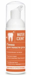 Внешний вид: прозрачная жидкость золотистого цвета, при нажатии на дозатор преобразуется в густую белую пену.Специальные особенности:Без фтора! Без сахара! Не содержит лаурилсульфат натрияПоливинилпирролидон эффективно удаляет мягкий налет, обеспечивая ощущение чистоты в полости рта.Биосол оказывает мощное бактерицидное действие. Натуральный компонент, не вызывает раздражения.Экстракты ромашки и шалфея нейтрализуют бактерии, вызывающие кариес и укрепляют десны.Экстракт алоэ обладает увлажняющим, противовоспалительным и заживляющим свойствами.Как почистить зубы, когда под рукой нет пасты и щетки?Всего за 5 секунд антибактериальная пенка WaterDent проникнет в труднодоступные места и удалит частички пищи и бактерии после еды и напитков. Экстракты ромашки и шалфея нейтрализуют бактерии, вызывающие кариес, и укрепят десны. Алоэ вера благодаря заживляющим свойствам устранит мелкие повреждения в полости рта и снимет воспаление. Мята придаст свежесть дыханию.У тебя брекеты? Тогда пенка — это лучшее решение!Результат:Оказывает мощное бактерицидное действие. Предотвращает воспаления тканей пародонта и кровоточивость десен.