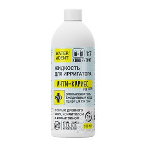WATERDENT ЖИДКОСТЬ ДЛЯ ИРРИГАТОРА+ОПОЛАСКИВАТЕЛЬ ЕЖЕДНЕВНОГО УХОД АНТИ-КАРИЕС TEENS /КОНЦЕНТРАТ 1:7 — ежедневный уход, со вкусом ягодВнешний вид и свойства: Однородная от бесцветного до светло-коричневого цвета жидкость с опалесценцией, запах приятный ягодный, вкус ягодно-мятный, освежающий.Жидкость для ирригатора "Антикариес".Идеальное средство для поддержания гигиены полости рта при наличии брекетов у подростков, а также для защиты от кариеса.Подходит для всей семьи начиная с 7 летАКТИВНЫЕ ИНГРЕДИЕНТЫ:-Ксилитол подавляет рост бактерий, вызывающих кариес.-Аллантоин предупреждает воспалительные процессы в полости рта.-Экстракты ягод и витамин С обогащают ткани десен витаминами и оказывают антиоксидантное действие.-Кальция пантотенат — источник кальция, способствует укреплению эмали.-Соль Древнего моря (Бишофит) — комплекс минералов (магния, кальция, натрия, калия и других соединений) обладает укрепляющим и антисептическим свойствами. Бишофит представляет собой природный магниевый полиминерал, обогащенный макро- и микроэлементами, и по составу превосходит известные аналоги: морскую соль, и в том числе соль Мертвого моря.-Биосол — бактерицидный компонент растительного происхождения, способствует снижению роста патогенных бактерий.Концентрат 1 флакон 500 мл = 4000 мл (при разведении1:7).Для усиления профилактического действия разбавить в соотношении 1:5.Результат: Защита от кариеса, гигиена полости рта и укрепление эмали.