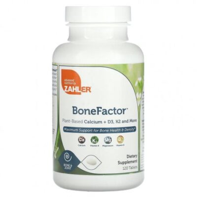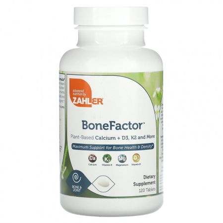 Максимальная поддержка здоровья и плотности костейКальций, витамин К, магний, витамин DКости и суставыПищевая добавкаFeel Better, Everyday™Сертификат кошерности Kosher PareveДанный продукт произведен на предприятии, сертифицированном по стандарту GMPБез глютенаНе содержит молочных продуктовНе содержит соиФормула для укрепления костей от стихийСинергетическая питательная смесь растительного кальция + стронция, магния и других элементарных питательных веществ. Zahler BoneFactor ™ — это формула повышенной прочности, разработанная для поддержания здоровья и плотности костей, а также зубов и десен. Рекомендации по применению Принимать по 4 таблетки в день, желательно по 2 таблетки два раза в день во время еды или в соответствии с рекомендациями врача. Ингредиенты Микрокристаллическая целлюлоза, стеариновая кислота, дикальций фосфат, кроскармеллоза натрия, стеарат магния, диоксид кремния, гидроксипропилметилцеллюлоза. Предупреждения Для поддержания здорового рациона могут потребоваться дополнительные добавки. Проконсультируйтесь с диетологом, чтобы определить подходящую вам формулу.Хранить в недоступном для детей месте. Не используйте, если защитная пленка повреждена или отсутствует. Если вы беременны, кормите грудью или принимаете лекарства, проконсультируйтесь с лечащим врачом.Поскольку этот продукт содержит витамин K2, прекратите его использование за 2 недели до операции.Хранить в плотно закрытой упаковке в сухом и прохладном месте. Пищевая ценностьРазмер порции: 4 таблеткиПорций в упаковке: 30 Количество в 1 порции% от суточной нормыВитамин C (в виде аскорбата магния)120 мг 133%