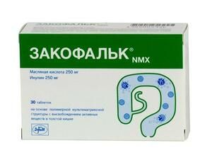Закофальк NMX — Биологически активная добавка к пище на основе полимерной мультиматриксной структуры с высвобождением масляной кислоты и инулина непосредственно в толстой кишке.Одна таблетка содержит:307 мг бутирата кальция (что соответствует 250 мг масляной кислоты)250 мг инулина. Масляная кислота в норме образуется в толстой кишке в результате расщепления нормальной микрофлорой кишки неперевариваемых углеводов, поступающих вместе с пищей. Основная функция масляной кислоты — снабжение энергией клеток слизистой оболочки толстой кишки (колоноцитов) и поддержание их в здоровом функциональномсостоянии.Масляная кислота как продукт жизнедеятельности полезных кишечных бактерий является основным регулятором водно-электролитного баланса в толстой кишке, способствует всасыванию избыточной воды в толстой кишке, предотвращая жидкий стул (диарею).Выступая в качестве энергетического и регулирующего субстрата для колоноцитов, масляная кислота регулирует процессы развития и обновления клеток слизистой оболочки толстой кишки, укрепляет защитный барьер слизистой оболочки, снижает висцеральную чувствительность толстой кишки к раздражающим стимулам, в первую очередь к растяжению толстой кишки при ряде состояний.Инулин является растворимым пищевым волокном, которое создает питательную среду для микрофлоры кишечника, тем самым стимулируя рост полезных бактерий (пребиотическое действие).В результате метаболизма инулина бактериями кишки также образуется эндогенная масляная кислота.Инулин является одним из широко применяемых классических пребиотиков.Инулин не переваривается пищеварительными ферментами человека и легко попадает в толстую кишку, где стимулирует рост полезных кишечных бифидобактерий.Соответственно, за счет роста полезных бактерий улучшается перистальтика толстой кишки и происходит образование полезных для организма бактериальных метаболитов.Инулин и метаболиты полезной микрофлоры толстой кишки оказывают позитивное влияние не только на обменные процессы в клетках толстой кишки, но и на обмен веществ в целом, обладают антиоксидатным действием, что является особенно важным для пожилых людей.Высвобождение активных веществ в толстой кишке. Для того, чтобы в полной мере реализовать свои основные биологические функции, масляная кислота при приеме внутрь должна попадать в толстую кишку, избегая преждевременного всасывания в вышележащих отделах желудочно-кишечного тракта. Это становится возможным благодаря использованию специальной технологии на основе полимерной мультиматриксной структуры, позволяющей таблеткам преодолевать в неизменном виде желудок и тонкий кишечник и достигать толстой кишки. На всем протяжении толстой кишки происходит постепенное высвобождение активных веществ. Полимерная мультиматриксная система (NMX) обеспечивает действие масляной кислоты и инулина на протяжении всего толстого кишечника в течение 24 часов.Специальные особенности: Не содержит лактозы, казеина и глютена.