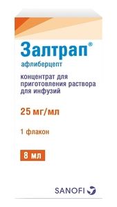 Показания к применениюМетастатический колоректальный рак (МКРР) (у взрослых пациентов), резистентный к оксалиплатин-содержащей химиотерапии или прогрессирующий после ее применения (препарат Залтрап в комбинации с режимом, включающим иринотекан, фторурацил, кальция фолинат (FOLFIRI)).Применение при беременности и кормлении грудьюДанные по применению афлиберцепта у беременных женщин отсутствуют. В экспериментальных исследованиях выявлено эмбриотоксическое и тератогенное действие афлиберцепта у животных. Т.к. ангиогенез имеет большое значение для развития эмбриона, ингибирование ангиогенеза при введении препарата Залтрап может вызывать эффекты, неблагоприятные для развития беременности. Применение препарата Залтрап при беременности противопоказано. Женщинам детородного возраста следует рекомендовать избегать зачатия во время лечения препаратом Залтрап. Они должны быть проинформированы о возможности неблагоприятного воздействия препарата Залтрап на плод.Женщины детородного возраста и фертильные мужчины должны использовать эффективные способы контрацепции во время лечения и, как минимум, в течение до 6 месяцев после введения последней дозы препарата.Существует вероятность нарушения фертильности у мужчин и женщин во время лечения афлиберцептом (исходя из данных, полученных в исследованиях, проведенных на обезьянах, у самцов и самок которых афлиберцепт вызывал нарушения фертильности, полностью обратимые через 8-18 недель).ПротивопоказанияПовышенная чувствительность к афлиберцепту или любому из вспомогательных веществ препарата Залтрап;— тяжелые кровотечения;— артериальная гипертензия, не поддающаяся медикаментозной коррекции;— хроническая сердечная недостаточность III-IV класса (по классификации NYHA);— печеночная недостаточность тяжелой степени (отсутствие данных по применению);— офтальмологическое применение или введение в стекловидное тело (в связи с гиперосмотическими свойствами препарата Залтрап);— беременность;— период грудного вскармливания;— детский и подростковый возраст до 18 лет (в связи с отсутствием достаточного опыта применения).Противопоказания к применению иринотекана, фторурацила и кальция фолината см. в инструкциях по их применению.С осторожностью: — почечная недостаточность тяжелой степени;— артериальная гипертензия;— клинически значимые заболевания сердечно-сосудистой системы (ИБС, хроническая сердечная недостаточность I-II класса по классификации NYHA);— пожилой возраст;— общее состояние ≥2 баллов по шкале для оценки общего состояния пациента ECOG (Восточной объединенной группы онкологов)СоставВ 1 мл афлиберцепт 25 мг. Вспомогательные вещества: натрия дигидрофосфата моногидрат — 0.5774 мг, натрия гидрофосфата гептагидрат — 0.2188 мг, лимонной кислоты моногидрат — 0.0443 мг, натрия цитрата дигидрат — 1.4088 мг, натрия хлорид — 5.84 мг, 0.1М раствор хлористоводородной кислоты или 0.1М раствор натрия гидроксида — до pH 5.9-6.5, сахароза — 200 мг, полисорбат 20 — 1 мг, вода д/и — до 1 мл