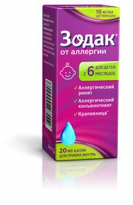Показания к применению— сезонный и круглогодичный аллергический ринит и конъюнктивит; — зудящие аллергические дерматозы; — поллиноз (сенная лихорадка); — крапивница (в т.ч. хроническая идиопатическая); — отек Квинке.Противопоказания— терминальная стадия почечной недостаточности (КК<10 мл/мин) (для приема таблеток); — наследственная непереносимость галактозы, недостаточность лактазы или синдром глюкозо-галактозной мальабсорбции (для приема таблеток); — детский возраст до 6 лет (для приема таблеток); — детский возраст до 1 года (для приема капель); — беременность; — период лактации (грудного вскармливания); — повышенная чувствительность к компонентам препарата.;С осторожностью: хроническая почечная недостаточность средней степени тяжести (требуется коррекция режима дозирования), пожилой возраст (возможно снижение клубочковой фильтрации). При приеме таблеток: хронические заболевания печени (гепатоцеллюлярный, холестатический или билиарный цирроз печени) (коррекция дозы требуется только при сопутствующем снижении скорости клубочковой фильтрации).СоставЦетиризина дигидрохлорид 10 мг.;Вспомогательные вещества: метилпарагидроксибензоат, пропилпарагидроксибензоат, глицерол, пропиленгликоль, натрия сахаринат дигидрат, натрия ацетат тригидрат, кислота уксусная ледяная, вода очищенная.Взаимодействие с другими препаратамиНе установлено клинически значимого взаимодействия цетиризина с другими лекарственными средствами.;Совместный прием с теофиллином (400 мг/сут) приводит к снижению общего клиренса цетиризина (кинетика теофиллина не изменяется).;В рекомендуемых дозах не усиливает действие этанола (при его концентрации в крови не более 0.8 г/л), тем не менее, рекомендуется воздерживаться от приема этанола во время лечения препаратом.