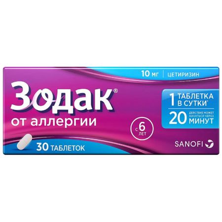 Показания Взрослым и детям в возрасте 6 лет и старше для облегчения: назальных и глазных симптомов круглогодичного (персистирующего) и сезонного (интермиттирующего) аллергического ринита и аллергического конъюнктивита (зуда, чиханья, заложенности носа, ринореи, слезотечения, гиперемии конъюнктивы); симптомов хронической идиопатической крапивницы. Фармакологическое действие Механизм действия Цетиризин — активное вещество препарата Зодак® — является метаболитом гидроксизина, обладает антигистаминным эффектом с противоаллергическим действием. Цетиризин относится к группе конкурентных антагонистов гистамина, блокирует гистаминовые Н1-рецепторы с небольшим воздействием на другие рецепторы и практически не оказывает антихолинергического и антисеротонинового действия. Цетиризин оказывает влияние на гистамин-зависимую стадию аллергических реакции немедленного действия, а также уменьшает миграцию эозинофилов и ограничивает высвобождение медиаторов при аллергических реакциях замедленного типа. Практически не проходит через гематоэнцефалический барьер и, следовательно, почти не способен достичь центральных гистаминовых Н1-рецепторов. Фармакодинамика В исследованиях влияния гистамина на кожу действие цетиризина в дозе 10 мг начиналось через 1 ч, достигало максимума со 2-го по 12-й ч и все еще наблюдалось на статистически значимых уровнях через 24 ч. В дополнение к антигистаминному эффекту цетиризин также обладает противовоспалительным эффектом и тем самым оказывает влияние на позднюю фазу аллергической реакции: в дозе 10 мг 1 или 2 раза/сут ингибирует позднюю фазу агрегации эозинофилов в коже; в дозе 30 мг/сут ингибирует выведение эозинофилов в бронхиальную альвеолярную жидкость после вызванного аллергеном бронхиального сужения; ингибирует вызванную калликреином позднюю воспалительную реакцию; подавляет экспрессию маркеров воспаления, таких как ICAM-1 или VCAM-1; ингибирует действие гистаминолибераторов, таких как PAF или субстанция Р. Лекарственное взаимодействие Одновременное применение с азитромицином, циметидином, эритромицином, кетоконазолом или псевдоэфедрином не влияет на фармакокинетические параметры цетиризина. Фармакокинетических взаимодействий не наблюдалось. Согласно испытаниям in vitro, цетиризин не влияет на эффект связывания белка варфарина. Одновременный прием азитромицина, эритромицина, кетоконазола, теофиллина и псевдоэфедрина не выявил существенных изменений в клинических лабораторных показателях, жизненно важных функциях и ЭКГ. В исследовании с одновременным приемом теофиллина (400 мг/сут) и цетиризина (20 мг/сут) было обнаружено незначительное, но статистически достоверное повышение 24-часовой AUC на 19% для цетиризина и на 11% для теофиллина. Кроме того, максимальные уровни в плазме крови увеличились до 7.7% и 6.4% соответственно для цетиризина и теофиллина. Одновременно клиренс цетиризина уменьшился на -16%, а также на — 10% в случае теофиллина, когда цетиризин принимали пациенты, которые ранее получали лечение теофиллином. Тем не менее, предварительное лечение цетиризином не оказало существенного влияния на фармакокинетические параметры теофиллина. После однократного приема цетиризина в дозе 10 мг эффект алкоголя (0.8%) значительно не усиливался; статистически значимое взаимодействие с 5 мг диазе