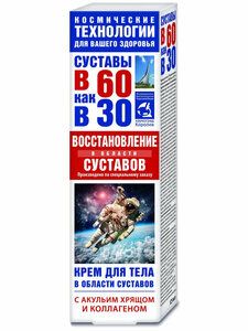 Линия Космические технологии для Вашего здоровья, суставы в 60 как в 30 — Крем для тела в обасти суставов акулий хрящ и коллаген (восстановление в области суставов)Внешний вид и свойства: консистенция густая, цвет прозрачный белый, нейтральный запахАктивные компоненты:-Акулий хрящ — превосходный биодоступный источник незаменимого хондроитина. Хондроитин — основной структурный компонент хряща и естественный защитник (хондропротектор) его клеток. Повышает влагоемкость хряща, предотвращает его высыхание.-Глюкозамин — неотъемлемый элемент хрящевой ткани. Обеспечивает выработку хондроитина, улучшает обменные процессы в суставах. Стимулирует производство гликозаминогликанов, необходимых для восстановления хрящевой ткани.-Коллаген — фибриллярный белок, является основой соединительной ткани организма, обеспечивает ее прочность и эластичность. При заболеваниях суставов способствует восстановлению хрящевой ткани и повышению качества синовиальной жидкости, укрепляет связки.Натуральное средство, разработанное совместно НПО «Королёв-фарм» и НПО «Космическая реабилитационная медицина» специально для предотвращения преждевременных и возрастных дегенеративно-дистрофических процессов в тканях суставов и активного обновления хрящевой ткани суставов пациентов в возрасте от 50 лет.Результат:• Улучшает обменные процессы в тканях суставов, стимулирует регенерацию хряща, способствует повышению объема и качества синовиальной жидкости, укреплению связочного аппарата.• С помощью нано-структуры, активные компоненты крема без труда проходят сквозь кожный барьер и быстро достигают очага заболевания, концентрируясь там и действуя до 24 часов.• Также, крем оказывает противовоспалительное действие, активно способствует процессам обновления суставов.• Благодаря согревающему эффекту, улучшает микроциркуляцию и питание суставов.