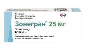 Показания к применению— монотерапия у взрослых пациентов с парциальными эпилептическими приступами с вторичной генерализацией или без, с впервые диагностированной эпилепсией;— в составе дополнительной терапии у взрослых, подростков и детей с 6 лет с парциальными эпилептическими приступами с вторичной генерализацией или без.Применение при беременности и кормлении грудьюЖенщины с сохраненным детородным потенциаломЖенщины с сохраненным детородным потенциалом должны применять надежные методы контрацепции во время лечения препаратом Зонегран; и на протяжении 1 месяца после его отмены.БеременностьНет достаточных данных о применении препарата Зонегран; у беременных женщин. Исследования на животных показали, что зонисамид потенциально обладает репродуктивной токсичностью, риск возникновения которой у людей неизвестен.Зонегран; не следует применять во время беременности, за исключением тех случаев, когда потенциальные преимущества, по мнению врача, преобладают над возможным риском для плода. Если женщина планирует беременность, следует проанализировать необходимость противосудорожной терапии. В случае назначения препарата Зонегран; рекомендуется тщательное наблюдение.Риск возникновения врожденных пороков развития у детей, чьи матери принимают противоэпилептические препараты, возрастает в 2-3 раза. Чаще всего выявляются следующие пороки: расщепление верхней губы, аномалии развития сердечно-сосудистой системы и дефекты нервной трубки. Комбинированная терапия противосудорожными препаратами сопровождается повышением риска развития врожденных пороков в сравнении с монотерапией.Недопустима резкая отмена противосудорожной терапии из-за риска развития эпилептического приступа, который может привести к серьезным последствиям, как для матери, так и для ребенка.Грудное вскармливаниеПрепарат выделяется с грудным молоком в концентрациях, аналогичных таковым в плазме, поэтому следует принять решение о прекращении кормления грудью или об отмене препарата у кормящих матерей. Вследствие длительного периода полувыведения грудное вскармливание может быть возобновлено не ранее чем через месяц после отмены препарата.Состав1 капсула содержит: зонисамид 25 мг.Вспомогательные вещества: масло растительное гидрогенизированное — 0.75 мг, целлюлоза микрокристаллическая — 49.06 мг, натрия лаурилсульфат — 0.19 мг.Состав капсульной оболочки: желатин — 36.895 мг, титана диоксид (E171) — 1.105 мг, чернила 1014 Текпринт SW-9008 (шеллак — 36.0-40.5 мкг, пропиленгликоль — 4.5-10.5 мкг, калия гидрохлорид — 0.075-0.150 мкг), краситель железа оксид черный (E172) — 36.0-42.0 мкг).