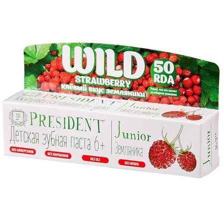Линия KIDS’ CHOICE (Детская коллекция) — зубные пасты с самыми необычными вкусами для маленьких непосед.Зубная паста детская PRESIDENT Junior Земляника (50 RDA) — для профилактики кариеса и детского стоматитаВозраст: 6+ лет- Безопасно и эффективно удаляет налет.- Обеспечивает длительный и эффективный уход за молочными и постоянными зубами.- Стимулирует процесс реминерализации, предотвращает разрушение эмали и развитие кариеса.Внешний вид и свойства: гелевая текстура с розовым цветом и запахом земляники, клёвый вкус земляникиПоказатель абразивности: 50 RDA.RDA* — это строгий контроль за размером и концентрацией абразивных частиц.Абразивом являются сферолиты SYLOBLANC, которые безопасно и эффективно удаляют налёт, очищают и полируют зубную эмаль.Активные компоненты:-Эстракт липы — (Tilia Cordata Flower Extract) — успокаивающее, болеутоляющее, противомикробное, противовоспалительное действие-Экстракт ромашки — (Chamomilla Recutita Extract) — противовоспалительное, болеутоляющее действие, усиление регенеративных процессов-Экстракт алоэ вера — противовоспалительное действие-Витамин Е — замедляет процесс старения клеток-Витамины группы B — повышают эластичность дёсен, насыщают ткани кислородом-Биодоступный кальций — кальция карбонат, кальция глицерофосфатУровень абразивности (RDA): 50 — подходит детям для ежедневного применениОригинальный вкус и аромат земляники обеспечивает длительную свежесть дыхания и поднимает настроение!Специальные особенности: Без фтора, без парабенов, без SLS, без аллергенов