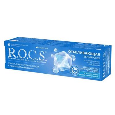 Красивая белоснежная улыбка и здоровье полости рта – таковы основные функции зубной пасты R.O.C.S. «Отбеливающая. Белый стих». В основе данной пасты заложен запатентованный комплекс MINERALIN®, богатый полезными соединениями и микроэлементами. Дополнительно он усилен микрочастицами диоксида кремния, которые наделяют состав выраженными полирующими свойствами. Благодаря такой уникальной формуле R.O.C.S. «Отбеливающая. Белый стих» обеспечивает заметное осветление эмали, ее бережную полировку и укрепление; зубы приобретают красивый естественный оттенок, становятся более блестящими; обеспечивается их защита от кариеса, образования зубного камня; существенно замедляется образование налета, нормализуется микрофлора полости рта. Паста для зубов R.O.C.S. «Отбеливающая. Белый стих» рекомендована лицам старше 18 лет, желающим осветлить зубную эмаль, обеспечить ее блеск, а так же, предупредить потемнение. Паста подходит для регулярного ежедневного использования. Она осуществляет не только эстетическую функцию, осветляя эмаль, обеспечивая ее здоровый блеск, но и оказывает выраженные терапевтические и гигиенические эффекты: качественно удаляет налет, замедляет оседание бактерий на слизистой рта и зубах, освежает дыхание, снимает воспалительные процессы десен и т.д. Отбеливающая и полирующая зубная паста R.O.C.S. «Белый стих» имеет запатентованную формулу, в основе которой заложен комплексе MINERALIN®, усиленный специальными микрочастицами диоксида кремния. Все активные компоненты пасты обладают индивидуальным механизмом действия, обеспечивая комплексный уход за полостью рта: — ксилит, получаемый из зерновых культур – обладает свойствами пребиотика, защищает от бактерий, способных вызывать кариес, улучшает усвоение кальция; — бромелаин, являющийся специальным растительным ферментом, который получают из стеблей и плодов ананаса. Бромелаин бережно растворяет мягкий зубной налет, обладает противовоспалительными свойствами, препятствует закреплению бактерий на зубах и слизистой рта. Данный фермент более 30 лет активно применяется в различных областях медицины, польза и обоснованность его применения доказаны многократно; — глицерофосфат кальция и хлорид магния – минеральные соединения дружественные и родственные человеческому организму. Они укрепляют дентин и эмаль, возвращают им здоровую белизну; — микрочастицы диоксида кремния – бережно удаляют темный окашивающий налет (от сигарет, кофе и прочего), полируют эмаль, придают ей белизну и красивый блеск. В результате регулярного использования, зубная паста R.O.C.S. Отбеливающая «Белый стих»: — эффективно удаляет мягкий, а так же, темный зубной налет; — осветляет зубную эмаль, придает ей блеск; — обеспечивает длительную чистоту зубов и десен; — устраняет воспаления, кровоточивость десен; — укрепляет эмаль и дентин; — предупреждает образование зубного камня и темного налета; — предупреждает развития кариеса; — нормализует микрофлору полости рта, устраняет дисбактериоз. Высокая эффективность и положительные качества R.O.C.S. Отбеливающая «Белый стих» доказаны лабораторными и клиническими исследованиями. Противопоказания Индивидуальная непереносимость отдельных компонентов зубной пасты R.O.C.S. «Белый стих» (отмечается крайне редко).