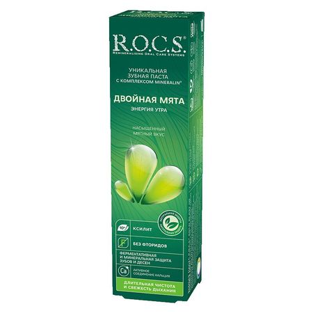 Приятный освежающий вкус, длительное ощущение чистоты и эффективная защита от кариеса – новая зубная паста R.O.C.S. «Энергия утра» сочетает в себе все необходимые качества для комплексной гигиены полости рта. Она имеет насыщенный приятный вкус двойной мяты, заряжая бодростью и отличным настроением на весь день. Уникальный комплекс MINERALIN®, входящий в состав этой пасты, эффективно удаляет зубной налет, значительно замедляя его последующее образование, деликатно отбеливает эмаль, насыщает ткани ротовой полости необходимыми микроэлементами. Дополнительное преимущество R.O.C.S. «Энергия утра» в том, что данная паста подходит для семейного использования (начиная от 4-х лет). Зубная паста R.O.C.S. «Энергия утра» со вкусом «Двойная Мята» рекомендована для регулярного ежедневного применения взрослым и детям, начиная с 4-х лет. Она имеет лечебно-профилактическое действие. Уникальный состав пасты способствует качественному очищению зубов, предупреждению развития кариеса и зубного камня. Уникальный минеральный комплекс обеспечивает укрепление твердых тканей зуба, а также, профилактику воспалительных прочесов десен, что является важными аспектами ежедневной гигиены, как во взрослом, так и в детском возрасте. Паста для зубов R.O.C.S. «Энергия утра» («Двойная Мята») имеет в своем составе запатентованный комплекс активных микроэлементов, которые оказывают благотворное воздействие на различные обменные процессы и ткани ротовой полости: — ксилит (вещество, получаемое из зерновых культур) обладает свойствами пребиотика, защищает от кариесогенных бактерий, способствует усвоению кальция; — бромелаин (очищенный фермент, получаемый из стеблей и плодов ананаса) обладает противовоспалительными свойствами, деликатно растворяет зубной налет, препятствуя последующей фиксации бактерий на слизистой рта и зубах; — хлорид магния и глицерофосфат кальция – дружественные, родственные организму человека минералы, которые возвращают зубам естественную белизну, укрепляют дентин и эмаль. Комплекс MINERALIN® и дополнительные компоненты обеспечивают следующие выраженные положительные эффекты от применения зубной пасты РОКС «Энергия утра»: — бережное удаление налета; — осветление зубной эмали, придание ей естественного здорового блеска; — профилактика образования темного налета, появления зубного камня; — предупреждение развития кариеса; — реминерализация, укрепление твердых тканей зубов; — устранение воспалений и кровоточивости десен (симптомы отечности, кровоточивости и воспаления десен снижаются в среднем до 86 % уже в течение первой недели применения); — устранение дисбактериоза, нормализация микрофлоры полости рта (паста обладает свойствами пребиотика); — обеспечение свежести дыхания, длительное сохранение данного эффекта в течение дня. Высокие положительные свойства зубной пасты R.O.C.S. «Энергия утра. Двойная Мята» доказаны многократными лабораторными и клиническими исследованиями. Уникальный состав продукции защищен патентами. Противопоказания Индивидуальная (крайне редкая) непереносимость отдельных компонентов зубной пасты.