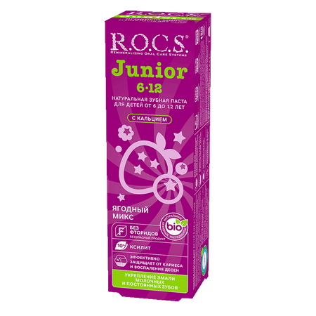 Натуральная зубная паста R.O.C.S. Junior. «Ягодный Микс» разработана специально для детей в возрасте от 6 до 12 лет. Уникальный состав пасты учитывает все особенности этого возрастного периода, помогая облегчить смену молочных зубов на постоянные. Формула R.O.C.S. Junior. со вкусом «Ягодный Микс» содержит кальций, фосфор, магний и вспомогательные компоненты, совокупность которых обеспечивает укрепление эмали и защиту от кариеса, как молочных, так и первых постоянных зубов. Вместе с этим, необычный вкус сочных ягод позволяет сделать ежедневную гигиену полости рта приятной для ребенка. Паста зубная R.O.C.S. Junior. «Ягодный Микс» рекомендована детям в возрасте от 6 до 12 лет, в период смены молочных и роста первых постоянных зубов. Уникальный минеральный комплекс насыщает тонкую молодую эмаль необходимыми компонентами. Благодаря этому облегчается процесс смены зубов. Зубы у ребенка растут более крепкими; усиливается блеск и здоровая белизна эмали. Паста имеет максимально натуральный состав; безопасна при случайном проглатывании. Основными компонентами зубной пасты для детей R.O.C.S. Junior. «Ягодный Микс» являются: — двойной экстракт коры осины (Pópulus trémulа), состоящий из комбинации экстрактов на основе СО2 и воды. Он представляет собой богатейший источник биологически активных компонентов, которые улучшают обменные процессы и оказывают комплексное противовоспалительное успокаивающее действие на ткани пародонта; — магния хлорид и кальция глицерофосфат – это минеральный комплекс, включающий в себя все необходимые компоненты, представленные в особой форме, с высоким уровнем биологической доступности. Они активно насыщают эмаль зубов, повышая ее механическую прочность, устойчивость к воздействию кислот и кариесогенных бактерий; — КСИЛИТ 12% – обеспечивает пребиотическое влияние, нормализует состав микрофлоры, подавляет активность вредоносных микроорганизмов, препятствует образованию зубного налета. Благодаря запатентованному компонентному составу, натуральная зубная паста для детей R.O.C.S. Junior со вкусом «Ягодный Микс»: — эффективно удаляет зубной налет; — снимает воспалительные процессы в ротовой полости, устраняет кровоточивость десен, отечность; — нормализует микрофлору полости рта; — насыщает эмаль активными БИОдоступными ионами кальция, магния и фосфора; — укрепляет зубную эмаль; — обеспечивает высокий уровень защиты от кариеса; — придает эмали красивую белизну и здоровый блеск; — препятствует образованию зубного налета. Положительный эффект от применения R.O.C.S. Junior «Ягодный Микс» подтвержден лабораторными и клиническими исследованиями. Противопоказания Индивидуальная (редкая) непереносимость отдельных ингредиентов детской зубной пасты R.O.C.S. Junior «Ягодный Микс».