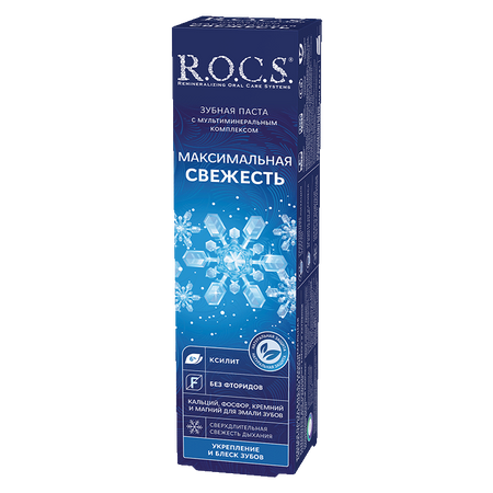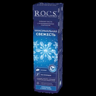 R.O.C.S. Зубная паста «Максимальная свежесть» — обладает ярким мятным ароматом, созданным на основе уникальных компонентов. Дарит невероятно длительное ощущение свежести дыхания, гладкости и чистоты эмали зубов.Для того, чтобы дыхание оставалось свежим максимально долго, в составе пасты использован специальный ароматизатор, медленно ферментирующийся в полости рта — даже чашка любимого кофе или поздний завтрак не разрушат ощущение свежести после чистки зубов зубной пастой R.O.C.S.® Максимальная свежесть!Мультиминеральный комплекс пасты включает кальций, фосфор, кремний и магний в оптимальном для зубов соотношении. В составе зубной пасты кальций обладает высокой биодоступностью, возвращает белизну и блеск эмали, повышает устойчивость зубов к кариесу. Ксилит (6%) способствует минерализации эмали, защищает от кариесогенных бактерий, регулирует баланс микрофлоры во рту.Не содержит фтор, антисептики, синтетические красителиФормула зубной пасты защищена патентами