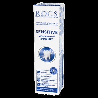 Здоровая белизна улыбки и повышенная чувствительность зубов – понятия, считавшиеся несовместимыми даже в современной стоматологии. Согласно статистике, более 70 % взрослого населения мира страдают от гиперчувствительности зубной эмали и дентина. Эти проблемы приводят к неизбежным болезненным ощущениям во время употребления горячей и холодной пищи, сладостей, продуктов, содержащих кислоты и т.д. В таких условиях профессиональное отбеливание, а также, использование отбеливающих паст, порошков и других подобных составов просто не допустимо. Новая зубная паста R.O.C.S. SENSITIVE «Мгновенный Эффект» разработана научной российско-швейцарской лабораторией WDS специально для повышения белизны и улучшения внешнего вида гиперчувствительных зубов. Данная зубная паста имеет неабразивную консистенцию (RDA=40), за счет чего она не царапает, не повреждает эмаль и дентин. Принципиальным отличием ее состава является кальция гидроксиапатит, синтезированный предприятием-производителем по уникальной запатентованной технологии. Частицы гидроксиапатита, входящие в состав пасты, измельчены до состояния мелкого разноразмерного порошка, что обеспечивает их высокое сродство с естественными тканями зуба. Частицы кальция гидроксиапатита запечатывают канальцы обнаженного дентина и мельчайшие дефекты эмали, за счет чего достигается практически мгновенное снижение чувствительности. Человек не только избавляется от неприятных ощущений, периодически возникающих в ротовой полости, но и приобретает естественную красивую белизну улыбки. Зубная паста ROCS SENSITIVE Мгновенный Эффект рекомендована людям, страдающим от повышенной чувствительности зубов, а также тем, кто выбирает своевременную заботу о здоровье полости рта. Уникальный состав зубной пасты SENSITIVE «Мгновенный Эффект» обеспечивает профилактику и лечение — нарушений целостности зубной эмали; — появления/наличия канальцев обнаженного дентина; — ·возникновения кариеса и других заболеваний; — возникновения болезненных ощущений при употреблении горячей/холодной, сладкой, кислой пищи, при попадании холодного воздуха в полость рта и т.д. При регулярном использовании, человек полностью забывает о повышенной чувствительности зубов. Высокая быстрота и результативность использования зубной пасты R.O.C.S. SENSITIVE «Мгновенный Эффект» достигается за счет трех направлений воздействия: — моментального запечатывания мелких дефектов эмали и канальцев незащищенного дентина, обеспечивая снижение чувствительности зубов; — минерального восстановления естественных (собственных) структур зуба благодаря высокой биологической доступности кальция глицерофосфата, как источника ионных форм фосфата и кальция; — восстановления и защиты твердых тканей зубов путем активации собственных физиологических процессов, что достигается за счет высокого содержания в составе пасты ксилита и магния. Зубная паста R.O.C.S. SENSITIVE Мгновенный Эффект, помимо быстрого устранения чувствительности зубов*: — не травмирует эмаль и дентин зуба; — нормализует, улучшает состав микрофлоры полости рта; — эффективно защищает от кариеса*; — выравнивает поверхность зубов, возвращает им блеск; — оказывает отбеливающее воздействия, за счет восстановления естественного здорового состояния эмали; — освежает дыхание; — имеет низкую абразив
