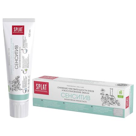 Бренд SPLAT (Сплат) — ведущий разработчик и производитель профессиональных решений в категориях ухода за полостью рта. SPLAT PROFESSIONAL ЗУБНАЯ ПАСТА СЕНСИТИВ Внешний вид: Консистенция — пастообразная текстура Цвет — белый Специальные особенности: Не содержит: SLS, фтор, спирт, триклозан, хлоргексидин, химические отбеливающие компоненты, синтетические ароматизаторы. Продукция сертифицирована по стандарту Халяль. Антибактериальная зубная паста SPLAT SENSITIVE для снижения чувствительности зубов и восстановления эмали, 100 мл СНИЖЕНИЕ ЧУВСТВИТЕЛЬНОСТИ ЗУБОВ И ВОССТАВНОЛЕНИЕ ЭМАЛИ Защита от бактерий — экстракт грецкого ореха и эфирного масла лимона обладают Антибактериальным эффектом Эффективная укрепляющая зубная паста для людей с повышенной чувствительностью зубов. Эффективно расщепляет зубной налет и делает поверхность зубов идеально гладкой благодаря сочетанию натурального фермента из папайи (Papain) с высокомолекулярным отбеливающим компонентом Polydon®. Инновационная система Sp.White System® безопасно отбеливает и полирует эмаль до блеска. Эффект: — Восстанавливает эмаль, восполняет потерю минералов и снижает чувствительность зубов благодаря гидроксиапатиту кальция (nHap). Эффективность доказана клинически. — Снижает кровоточивость десен благодаря эфирным маслам ромашки и испанского лимона. — Обладает антиоксидантным действием и защищает от бактерий благодаря витаминам С, РР, Е, флавоноидам и компоненту Biosol. Новая BIO-формула. Результат: Клинически доказано: Очищающий эффект — 55% Кровеостанавливающий эффект — 32,81%. Реминерализующий эффект — 27,42%. Десенситивный эффект-59% Противовоспалительный эффект-36,98% Дезодорирующий эффект-42,67% *после 4 недель применения.