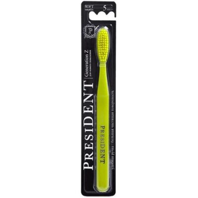 PRESIDENT Generation Z — зубная щетка для подростков. Показатель жесткости: 5 МИЛ (SOFT). Большая головка обеспечивает быстрое очищение внешних, внутренних и жевательных участков зубного ряда. Закругленные нейлоновые щетинки Medex деликатно полируют зубную эмаль и не травмируют десны. Позволяет бережно очищать зубной налет, а также предотвращает образование зубного камня и подросткового гингивита.