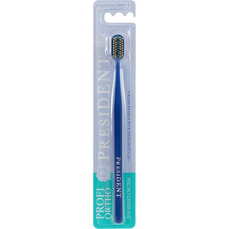 Зубная щётка PRESIDENT PROFI ORTHO ОРТОДОНТИЧЕСКАЯ арт. 728 — щетка со специальным профилем щетины с укороченным средним рядом для профессионального ухода за полостью рта в период использования брекет-систем.Внешний вид и свойства:Разноцветные яркие ручки и щетинаЖесткость щетины: средняя.Щетинки диаметром 6 мил, со специальным профилем, эффективно очищают эмаль и брекет-систему от налета.Закругленные и отполированные кончики щетины не повреждают эмаль и не травмируют десны.Удобная ручка из гигиенически безопасного PETG комфортна при использовании.Результат: Тщательное очищение от налета брекет-системы и эмалиКомпактная головка обеспечивает бережное очищение всех участков зубного ряда. Профиль щетины с укороченным средним рядом позволяет одновременно очищать брекеты и поверхность зубов и десен. Специально подобранная степень жесткости щетины (6 МИЛ*) позволяет тщательно удалять налёт, в том числе с элементов брекет-системы.