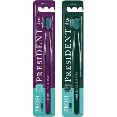 Линия Profi (PROFESSIONAL) — ПРОФЕССИОНАЛЬНАЯ КОЛЛЕКЦИЯ — Коллекция специализированных средств по лечению и уходу за полостью рта. Для тех, кому нужен дополнительный уход за зубами и деснами.Зубная щётка PRESIDENT PROFI Soft 4000 — Увеличенное количество щетинок ~4000.Внешний вид и свойства:Цвет и форма ручки: прозрачная, округлая.Цвет и жесткость щетины: желтая/малиновая, мягкая.4 000 активных щетинок диаметром 5 мил** МИЛ — индекс жесткости щетины, показатель соотношения диаметра щетины и жесткости зубной щетки. Чем больше диаметр щетины, тем больше жесткость зубной щетки.Компактная рабочая часть обеспечивает тщательное и бережное очищение внешних, внутренних и жевательных участков зубного ряда.Мягкие, эластичные и идеально закругленные щетинки деликатно полируют зубную эмаль и не травмируют десны.Специально подобранная жесткость щетины (5 МИЛ*) бережно удаляет зубной налёт, в том числе в межзубных промежутках.Густая и плотная щетина более тщательно удаляет налет.Эргономичная ручка круглой формы позволяет соблюдать правильную технику чистки зубов, в том числе в пришеечной зоне и труднодоступных местах.Результат: Чистая, блестящая поверхность зубов.