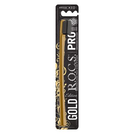 ROCS ЗУБНАЯ ЩЕТКА PRO GOLD EDITION/МЯГКАЯ — ультратонкая щетинаВнешний вид и свойства:Цвет и форма ручки: тонкая, изогнутая, предотвращает излишнее давление на десны и обеспечивает удобство во время чистки зубов.Цвет и жесткость щетины: золотая/черная, мягкая.Эксклюзивная гамма цветовых сочетаний золота и черного бархата в дизайне щетины, ручки и блистера предоставляет возможность каждому выбрать зубную щетку наиболее привлекательную именно для него и отражающую его индивидуальность.Специально спроектированная тонкая изогнутая форма ручки предотвращает излишнее давление на десны и обеспечивает удобство во время чистки зубовУВЕЛИЧЕНА ПЛОТНОСТЬ НАБИВКИ ЩЕТИНЫв сочетании с увеличенной площадью головки щетки, позволяет легко и качественно очищать поверхности зубовСИСТЕМА БЕЗОПАСНОЙ ЧИСТКИ ЗУБОВ TOOTHBRUSHING SAFETY PRO-SYSTEMОсобая форма щетины с уникальным треугольным сечением образует 3 чистящих ребра, повышая эффективность чистки поверхности зубов. Способствует деликатному массажу десен, качественно и мягко удаляет зубной налет и очищает промежутки между зубами.5940 УЛЬТРАМЯГКИХ ЩЕТИНОККоличество щетинок увеличено в 3 раза*, что в сочетании с использованием ультратонкой щетины особой формы Trilobal с уникальным треугольным сечением существенно повышает эффективность чистки зубов и обеспечивает деликатный массаж десенУНИКАЛЬНАЯ ИЗОГНУТАЯ ФОРМА РУЧКИСпециально разработанная тонкая изогнутая ручка предотвращает излишнее давление на десны и обеспечивает удобство во время чистки зубовТРОЙНАЯ ПОЛИРОВКА КОНЧИКОВУникальная технология тройной полировки кончиков щетины обеспечивает безопасность чистки и исключает возможность повреждения твердых тканей зубов и десен* по сравнению с классической щеткой R.O.C.S.Результат: Чистая, блестящая поверхность зубов.