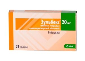 Показания к применениюЯзвенная болезнь желудка и двенадцатиперстной кишки в стадии обострения; гастроэзофагеальная рефлюксная болезнь (ГЭРБ): эрозивный рефлюкс-эзофагит (лечение), симптоматическое лечение ГЭРБ, в т.ч. длительная поддерживающая терапия; синдром Золлингера-Эллисона; в составе комплексной терапии: эрадикация Helicobacter pylori у пациентов с язвенной болезнью желудка и двенадцатиперстной кишки или хроническим гастритом; лечение и профилактика рецидива язвенной болезни, связанной с Helicobacter pylori.Применение при беременности и кормлении грудьюБеременность. Отсутствуют данные о безопасности применения рабепразола во время беременности у человека. Репродуктивные исследования у крыс и кроликов не выявили признаков нарушения фертильности или вредного воздействия рабепразола на плод. Препарат Зульбекс не применяется во время беременности. Лактация. Исследования у женщин в период лактации не проводились. Неизвестно, секретируется ли рабепразол в материнское молоко, но он секретируется в молоко крыс. При необходимости применения препарата Зульбекс в период лактации, грудное вскармливание следует прекратитьПротивопоказанияПовышенная чувствительность к активному веществу или вспомогательным компонентам препарата; беременность; период грудного вскармливания; детский возраст (отсутствует опыт применения). С осторожностью: тяжелая почечная недостаточность.СоставПантопразола натрия сесквигидрат Вспомогательные вещества: маннитол, кросповидон, натрия карбонат безводный, сорбитол, кальция стеарат. Состав оболочки: гипромеллоза, повидон, титана диоксид (E171), краситель железа оксид желтый (Е172), пропиленгликоль, дисперсия Эудрагит L30D (сополимер метакриловой кислоты и этилакрилата (1:1) дисперсия 30%, вода, натрия лаурилсульфат, полисорбат-80), тальк, макрогол 6000.Взаимодействие с другими препаратамиРабепразол вызывает стойкое и длительное подавление секреции соляной кислоты в желудке. Может возникнуть взаимодействие с препаратами, всасывание которых зависит от значений РН. Одновременное применение рабепразола с кетоконазолом или итраконазолом может привести к значительному снижению их концентрации в плазме крови, в связи с чем может потребоваться коррекция дозы этих препаратов. Ингибиторы протонной помпы, включая Зульбекс, не следует применять одновременно с атазановиром. Рабепразол замедляет выведение некоторых лекарственных средств, метаболизирующихся в печени путем микросомального окисления (диазепам, фенитоин, непрямые антикоагулянты). Концентрации рабепразола и активного метаболита кларитромицина в плазме при одновременном приеме увеличиваются. Снижает концентрацию кетоконазола и дигоксина в плазме крови