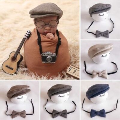 1 комплект, комплект с шапкой и бантом, кепка с узором «елочка» для новорожденных, регулируемый галстук-бабочка на шнуровке, легкий дышащий реквизит для фотосъемки малышей, наряд темно-серого