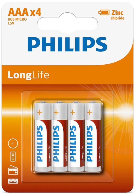Лучшие батарейки для маломощных устройств:Для ваших маломощных продуктов выбирайте батареи LongLife. Технология цинк-хлорида идеально подходит для ваших часов, радиоприемников, калькуляторов и пультов дистанционного управления.Высококачественная технология цинк-хлорида обеспечивает долгий срок службы:Высококачественная цинк-хлоридная технология обеспечивает длительный срок службы батареи при использовании в устройствах с низким энергопотреблением.Батарейки Philips ZnC не содержат 0 вредных тяжелых металлов:Эти батареи Philips гарантированно не содержат вредных тяжелых металлов, таких как кадмий и ртуть.Пригодны для использования в течение 3 лет:Каждая батарея страдает от потери энергии, когда не используется. Мы гарантируем, что батарея содержит не менее 80 своей первоначальной энергии в течение срока годности.Основные характеристики:Тип: батарейки цинково-хлоридныеФорм-фактор батареи: AAА/R03, хлорид цинкаНазначение: универсальныйХимический тип: цинково-хлоридныеНапряжение батареи: 1,5 ВКоличество в упаковке: 4 штукиТемпература хранения: от -20C до 30CУпаковка: блистерКомплектация:Батарейки цинково-хлоридные 4 штуки