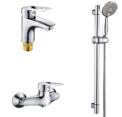 Набор из 2-х смесителей Материал изделия — латунь Комплектация: • смеситель на умывальний однорычажный • смеситель душевой однорычажный • лейка душевая • шланг 1,5 м.