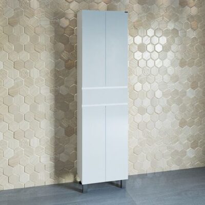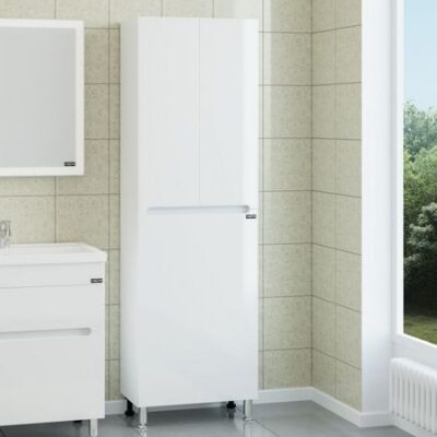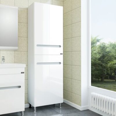 Шкаф-пенал напольный Марс белого цвета. Корпус изделия выполнен из влагостойкого ЛДСП, фасад из МДФ. Фасадные и боковые стенки мебели окрашены высокоглянцевой эмалью.