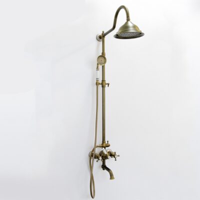 Душевая стойка Bronze — это набор, который состоит из ручной лейки, верхнего душа, смесителя, излива и штанги-трубы. Штанга монтируется на стену с помощью