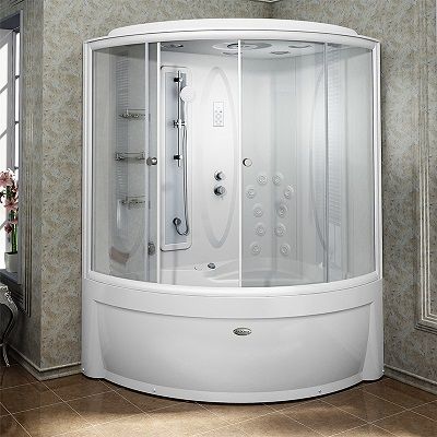 Душевая кабина «ДИАНА 3», поддон на раме-подставке с устройством слива, задняя стенка, крыша, стеклянные шторки (прозрачные), вертикальный душ «Тропический