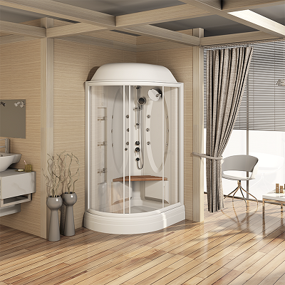 Душевой бокс «ДАНИЭЛА», чаша ванны, рама-подставка, слив-перелив полуавтоматический, фронтальная панель, боковые стенки, крыша, стеклянные шторки (прозрачные)