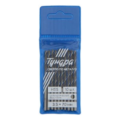 Сверло по металлу ТУНДРА, HSS, цилиндрический хвостовик, 3.5×70 мм, 10 шт.. Сверло с цилиндрическим хвостовиком предназначено для использования с дрелью.