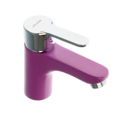 Однорычажный смеситель с коротким изливом устанавливается на раковину. Сантехника выполнена в фиолетовом цвете. Accoona