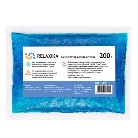 Компактный и экологичный аккумулятор тепла и холода Relaxika 200 гр имеет приятный дизайн, легок в использовании и характеризуется большой теплоемкостью. Такое устройство поможет перевезти продукты, напитки и медикаменты, поддерживая необходимые температурные условия в термосумке.