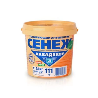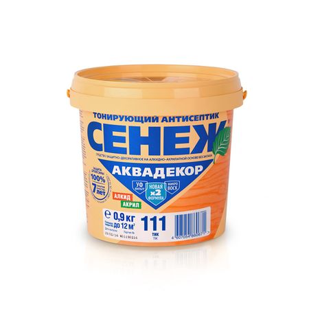 Антисептик для дерева Сенеж Аквадекор Х2-111 тик, 0,9 кг предназначен для долговременной защиты древесины от атмосферных осадков, плесневых, деревоокрашивающих и дереворазрушающих грибов, водорослей и насекомых-древоточцев, а также декоративной отделки под ценные породы. Готовый к применению водоразбавляемый состав на алкидно-акрилатной основе с добавлением льняного масла отлично проникает в древесину, формирует эластичное дышащее защитное покрытие с мягким шелковистым блеском. Материал используют для наружных и внутренних работ (окрашивание стен, обшивок, перегородок, фронтонов, дверей, оград, садовой мебели, фанеры, шпона, ДСП и ДВП, а также других пиленых, строганных, рубленых деревянных поверхностей). Допускается обработка антисептиком полов, перил, террас с последующим покрытием устойчивым к истиранию лаком.