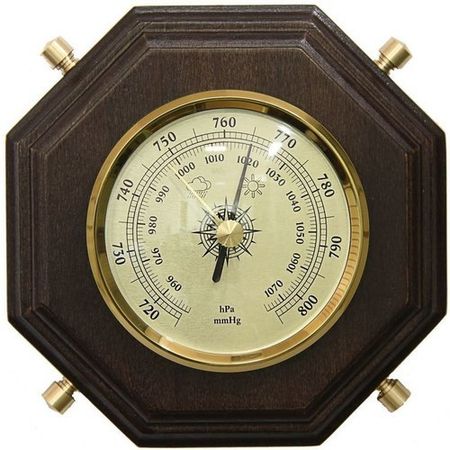 Барометр БРИГ БМ91012-В произведен в Санкт-Петербурге и представляет собой прибор из массива дерева с резьбой и вставками из высококачественной латуни. Корпус выполнен в виде восьмигранника с размерами 115 на 115 мм. Измеряемое давление от 720 до 800 мм.рт.ст. (960-1070 гПа). Гарантия на продукцию 12 месяцев.