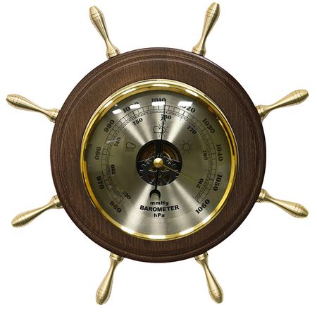 Барометр БРИГ БМ91325-1-В выполнен в форме штурвала, что обязательно привлечет любителей морской тематики. Корпус устройства представляет собой массив бука, а ручки изготовлены из высококачественной латуни. Механизм данной модели производится в Германии и характеризуется точностью, надежностью и долговечностью.
