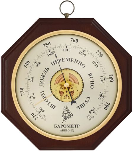 Барометр из массива БРИГ БМ91411-В соответствует цветовой гамме венге, что придает изделию строгий и сдержанный внешний вид. Восьмиугольный корпус изделия подвешивается на латунное кольцо — данный способ монтажа занимает минимум времени и сил. Точное определение давления поможет метеозависимым людям справится с его перепадами.