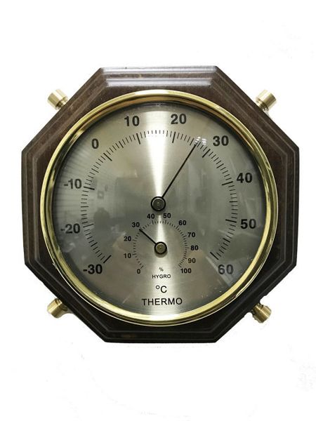 Бытовой барометр Бриг КМ91112(ТГ)-В в корпусе из натурального бука в цвете венге с 4 элементами декоративной отделки из полнотелой латуни, внешне напоминает восьмигранный штурвал корабля. Внутри установлены механизмы, позволяющие измерять температуру воздуха в диапазоне от -30 до +60 градусов Цельсия и процент относительной влажности от 0 до 100.