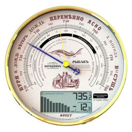 RST 05804 представляет собой модель электронно-механического барометра, отличающегося высокой точностью измерения атмосферного давления. Помимо привычного всем классического циферблата производитель установил в данном приборе ЖК-дисплей для вывода информации по изменению давления за определенный период времени 3/6/12 часов или последние сутки.