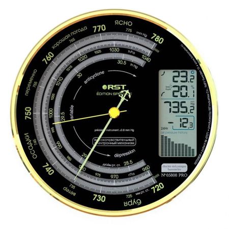 Серия барометров от шведской компании RST отличается наличием высокоточных цифровых датчиков давления, данные которых электронно-механическим методом передаются на классический круглый циферблат со стрелкой. Шкала прибора имеет разрешение 0,2 миллиметрртутного столба. Данные атмосферного давления выводятся одновременно и на механическом циферблате, и на жидкокристаллическом дисплее, на котором также отображается температура и влажность воздуха.