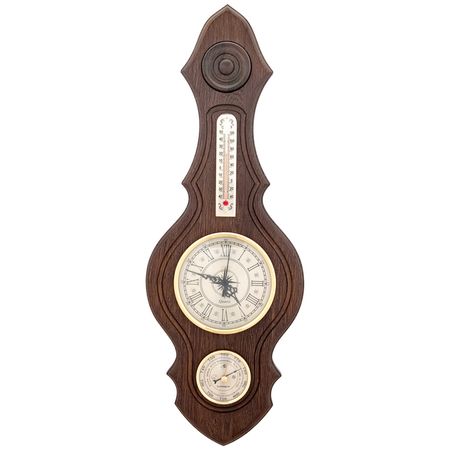 СМИЧ БМ-74 часы это небольшая домашняя метеостанция с часами в ее центральной части корпуса. Классическое оформление циферблата часов прекрасно гармонирует с исполнением остальных измерительных приборов и формой корпуса. В нижней части аксессуара установлен гигрометр, показывающий процент содержания влаги в воздухе, а в верхней части прибора вмонтирован изящный спиртовой термометр.