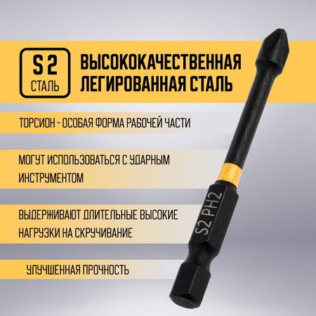 Бита ТУНДРА ПРОФИ, Torsion, сталь S2, PH2 х 65 мм, пластиковый кейс по 10 шт.. Набор бит с типом наконечника PH2 и длиной 65 мм — надежный инструмент для профессионалов. Торсионный механизм и сталь S2 обеспечивают долговечность и удобство использования. <b> Особенности</b> <ul> <li> Сталь S2 для прочности и долговечности.</li> <li> Торсионный механизм для защиты от повреждений.</li> <li> Универсальный хвостовик 1/4" для совместимости с различными инструментами.</li> <li> Пластиковый кейс для удобного хранения и защиты 10 бит.</li> </ul> <b> Преимущества использования</b> Биты с типом PH2 обеспечивают высокую производительность и надежность в работе. Торсионный механизм предотвращает повреждение бит и крепежа, что делает их идеальными для интенсивного использования. Пластиковый кейс упрощает хранение и транспортировку, сохраняя биты в отличном состоянии.