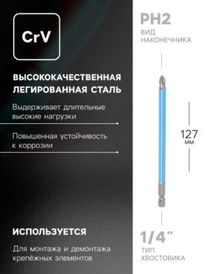 Биты ТУНДРА, намагниченные, сталь CrV, PH2 х 127 мм, 2 шт.. Бита марки TUNDRA предназначена для работ с шуруповертом при монтаже и демонтаже резьбовых соединений. Материал биты отличается высокой твердостью и износостойкостью, так как выполнена из высококачественной хромованадиевой стали. У биты имеется намагниченный наконечник, который упрощает работу с крепежом.