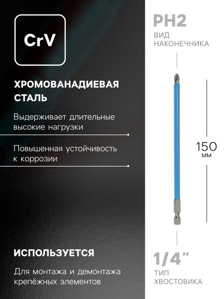 Биты ТУНДРА, намагниченные, сталь CrV, PH2 х 150 мм, 2 шт.. Намагниченные биты с наконечником PH2 из стали CrV – надежный инструмент для работы с крепежом. Длина 150 мм обеспечивает удобство при выполнении задач в труднодоступных местах. <b> Особенности</b> <ul> <li> Магнитное покрытие удерживает винты, исключая их падение.</li> <li> Сталь CrV гарантирует высокую прочность и стойкость к износу.</li> <li> Длина 150 мм позволяет работать даже в самых сложных условиях.</li> </ul> <b> Практическое применение</b> Комплект из двух бит идеально подходит для профессионального использования и домашних ремонтов. Намагничивание особенно важно при работе с мелкими деталями, где важно сохранить контроль над крепежом. <b> Прочность и долговечность</b> Инструмент с хвостовиком 1/4" совместим с большинством ручных и электроинструментов. Благодаря качественной стали CrV, биты сохраняют свои свойства даже после длительной эксплуатации. Производитель ТУНДРА создал решение, которое сочетает в себе надежность и практичность.