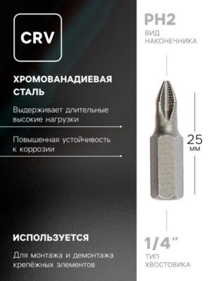 Биты ТУНДРА, намагниченные, сталь CrV, PH2 х 25 мм, 2 шт.. Набор бит TUNDRA basic применяется в качестве сменной оснастки ручного или электрического инструмента для монтажа и демонтажа резьбовых соединений. Материал, из которого изготовлены биты, отличается высокой твердостью и износостойкостью при работе на больших скоростях. Характеристики: <ul> <li> Размер: PH2 / 25 мм. </li> <li> Сталь: CrV. </li> <li> Твердость стали: HRc 48-52. </li> <li> Тип хвостовика: шестигранный. </li> <li> Количество: 2 шт. </li> </ul>
