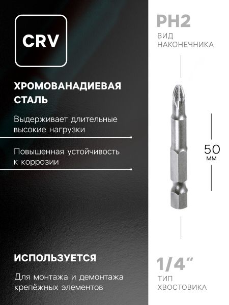Биты ТУНДРА, намагниченные, сталь CrV, PH2 х 50 мм, 2 шт.. Набор бит TUNDRA basic применяется в качестве сменной оснастки ручного или электрического инструмента для монтажа и демонтажа резьбовых соединений. Материал, из которого изготовлены биты, отличается высокой твердостью и износостойкостью при работе на больших скоростях. Характеристики: <ul> <li> Размер: PH2 / 50 мм. </li> <li> Сталь: CrV. </li> <li> Твердость стали: HRc 48-52. </li> <li> Тип хвостовика: шестигранный. </li> <li> Количество: 2 шт. </li> </ul>