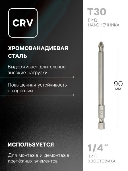 Биты ТУНДРА, намагниченные, сталь CrV, PH2 х 90 мм, 2 шт.. Намагниченные биты с наконечником PH2 из стали CrV – практичный выбор для точной работы с крепежом. Длина 90 мм обеспечивает удобство при выполнении задач различной сложности. <b> Особенности</b> <ul> <li> Магнитное покрытие надежно фиксирует винты во время работы.</li> <li> Сталь CrV гарантирует прочность и долговечность инструмента.</li> <li> Комплект из двух бит позволяет быстро менять насадки без потери времени.</li> </ul> <b> Практичное применение</b> Инструмент отлично подходит для сборки мебели, ремонта техники и других работ, где требуется аккуратность. Намагниченный наконечник особенно полезен при работе с мелкими деталями, предотвращая их потерю. <b> Долговечность и совместимость</b> Благодаря хвостовику 1/4", биты совместимы с большинством современных ручных и электроинструментов. Сталь CrV обеспечивает стойкость к механическим нагрузкам, а продуманная конструкция позволяет использовать инструмент длительное время без потери качества.