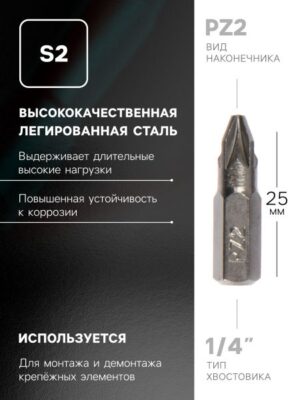 Биты ТУНДРА, намагниченные, сталь S2, PZ2 х 25 мм, 2 шт.. Компактные намагниченные биты с наконечником PZ2 из стали S2 – идеальное решение для точной работы с крепежом. Длина 25 мм обеспечивает удобство использования даже в самых сложных местах. <b> Основные преимущества</b> <ul> <li> Магнитный наконечник надежно фиксирует винты, предотвращая их падение.</li> <li> Сталь S2 гарантирует высокую прочность и устойчивость к механическим нагрузкам.</li> <li> Набор из двух бит позволяет быстро менять насадки без потери времени.</li> </ul> <b> Практичное применение</b> Инструмент отлично подходит для мелкого ремонта, сборки техники и других задач, требующих внимания к деталям. Намагниченный наконечник особенно полезен при работе с маленькими деталями, позволяя сохранять контроль над крепежом. <b> Долговечность и совместимость</b> Благодаря хвостовику 1/4", биты совместимы с большинством современных ручных и электроинструментов. Сталь S2 обеспечивает стойкость к износу, а продуманная конструкция гарантирует длительный срок службы без потери качества.